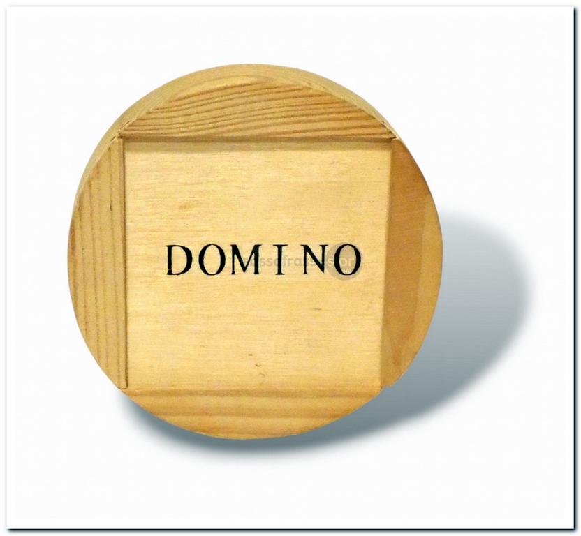 Dit dominospel bestaat uit kleine houten stenen (3,4 x1,6 cm) die opgeborgen worden in een ronde houten doos.