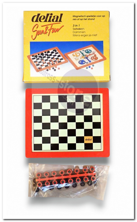 Conditie: nieuw, de speelstukken voor het schaakspel ontbreken helaas